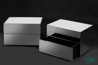 Mesas de apoio em espelho, com retro-iluminação no tampo.