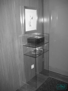 Consola em vidro float incolor, temperado de 10mm de espessura, com duas prateleiras, colada a UV.