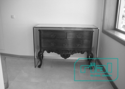 Consola em vidro float incolor, temperado de 12mm de espessura com aresta/chanfre a 45º, colagem UV.