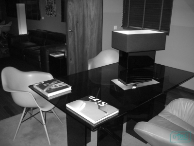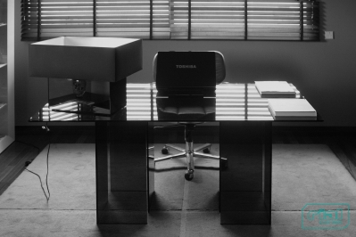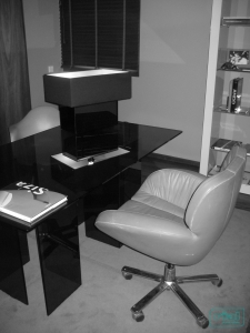 Secretária em vidro transparente bronze, temperado de 10mm de espessura com aresta/chanfre a 45º e colagens a UV.